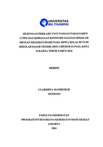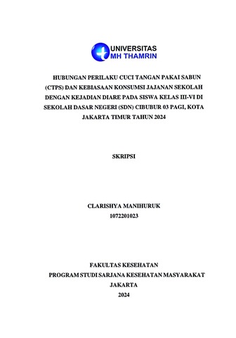 Clarishya, Manihuruk (2024) HUBUNGAN PERILAKU CUCI TANGAN PAKAI SABUN (CTPS) DAN KEBIASAAN KONSUMSI JAJANAN SEKOLAH DENGAN KEJADIAN DIARE PADA SISWA KELAS III-VI DI SEKOLAH DASAR NEGERI (SDN) CIBUBUR 03 PAGI, KOTA JAKARTA TIMUR TAHUN 2024. Other thesis, UNIVERSITAS MOHAMMAD HUSNI THAMRIN.