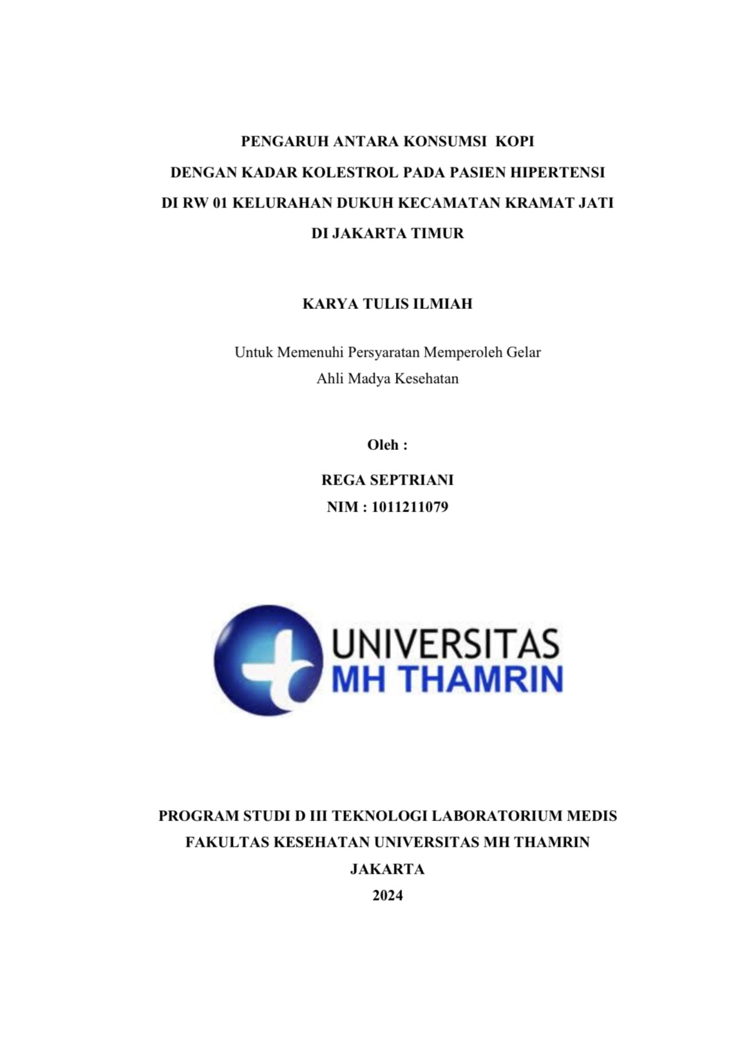 Rega, Septriani (2024) PENGARUH ANTARA KONSUMSI KOPI DENGAN KADAR KOLESTEROL PADA PASIEN HIPERTENSI DI RW 01 KELURAHAN DUKUH KECAMATAN KRAMAT JATI DI JAKARTA TIMUR. Diploma thesis, Universitas Mohammad Husni Thamrin.