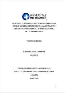 Khansa Nabila, Asmarani (2024) HUBUNGAN PENGETAHUAN DAN DUKUNGAN KELUARGA DENGAN KUALITAS HIDUP PASIEN GAGAL GINJAL KRONIK YANG MENJALANKAN HEMODIALISA DI RS BYAHANGKARA TK 1 PUSDOKKES POLRI. Other thesis, Universitas Mohammad Husni Thamrin.