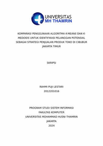 Rahmi Puji, Lestari (2024) KOMPARASI PENGGUNAAN ALGORITMA K-MEANS DAN K-MEDOIDS UNTUK IDENTIFIKASI PELANGGAN POTENSIAL SEBAGAI STRATEGI PENJUALAN PRODUK TOKO DI CIBUBUR JAKARTA TIMUR. Other thesis, Universitas Mohammad Husni Thamrin.
