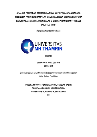 Dhita Putri Apma, Gultom (2024) ANALISIS PENYEBAB RENDAHNYA NILAI MATA PELAJARAN BAHASA INDONESIA PADA KETERAMPILAN MEMBACA SISWA DIBAWAH KRITERIA KETUNTASAN MINIMAL (KKM) KELAS V DI SDN PINANG RANTI 04 PAGI JAKARTA TIMUR. Other thesis, Universitas Mohammad Husni Thamrin.