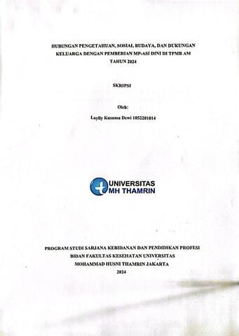 Laylly Kusuma, Dewi (2024) HUBUNGAN PENGETAHUAN, SOSIAL BUDAYA, DAN DUKUNGAN KELUARGA DENGAN PEMBERIAN MP-ASI DINI DI TPMB AM TAHUN 2024. Other thesis, Universitas Mohammad Husni Thamrin.
