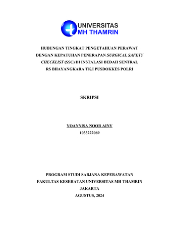 Yoannisa Noor, Ainy (2024) HUBUNGAN TINGKAT PENGETAHUAN PERAWAT DENGAN KEPATUHAN PENERAPAN SURGICAL SAFETY CHECKLIST (SSC) DI INSTALASI BEDAH SENTRAL RS BHAYANGKARA TK.I PUSDOKKES POLRI. Other thesis, Universitas Mohammad Husni Thamrin.