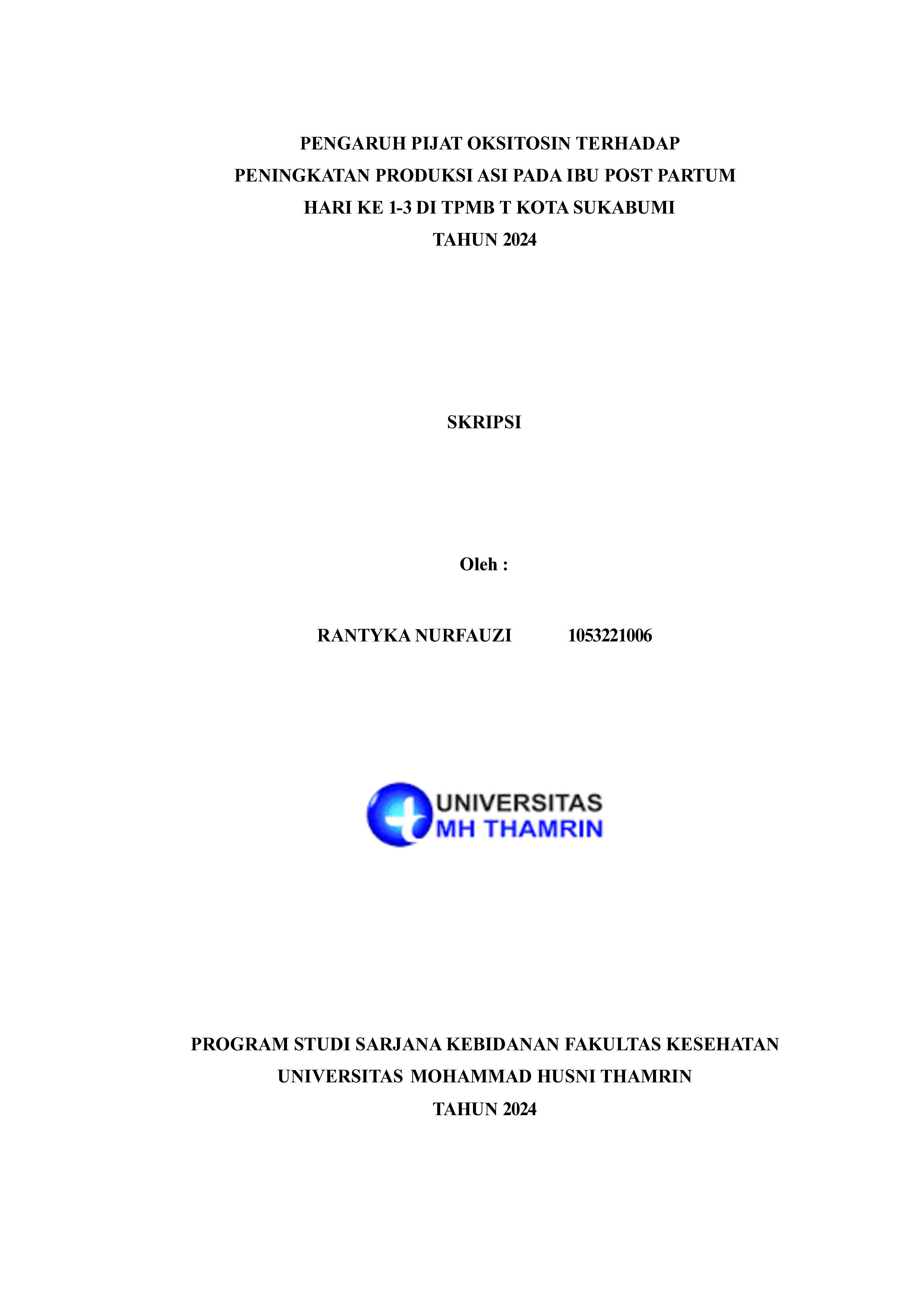 Rantyka, Nurfauzi (2024) Pengaruh Pijat Oksitosin terhadap Peningkatan Produksi Asi pada Ibu Post Partum Hari ke 1 - 3 di TPMB T Kota Sukabumi Tahun 2024. Other thesis, Universitas Mohammad Husni Thamrin.
