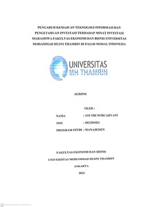 Ani Tri, Nurcahyani (2024) PENGARUH KEMAJUAN TEKNOLOGI INFORMASI DAN PENGETAHUAN INVESTASI TERHADAP MINAT INVESTASI MAHASISWA FAKULTAS EKONOMI DAN BISNIS UNIVERSITAS MOHAMMAD HUSNI THAMRIN DI PASAR MODAL INDONESIA. Other thesis, Universitas Mohammad Husni Thamrin.