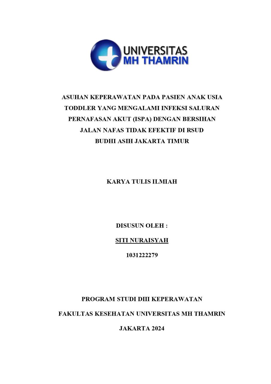 Siti, Nuraisyah (2024) Asuhan Keperawatan Pada Pasien Anak Usia Toddler yang Mengalami Infeksi Saluran Pernafasan Akut (ISPA) dengan Bersihan Jalan Nafas Tidak Efektif di RSUD Budhi Asih. Diploma thesis, Universitas Mohammad Husni Thamrin.