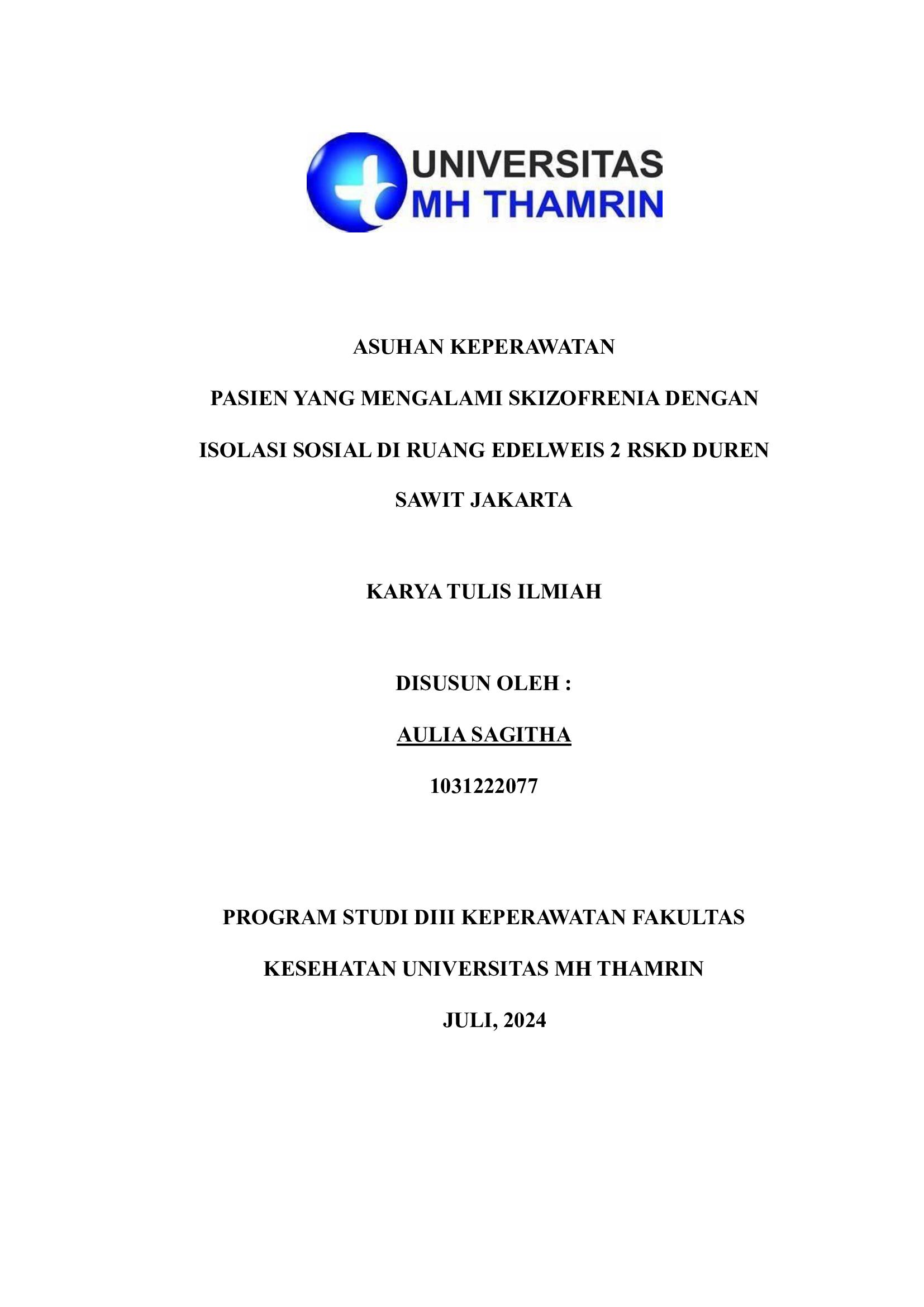 Aulia, Sagitha (2024) ASUHAN KEPERAWATAN PASIEN YANG MENGALAMI SKIZOFRENIA DENGAN ISOLASI SOSIAL DI RUANG EDELWEIS 2 RSKD DUREN SAWIT JAKARTA. Diploma thesis, Universitas Mohammad Husni Thamrin.