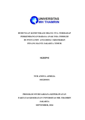 Nur Anisya, Afrilia (2024) HUBUNGAN KOMUNIKASI ORANG TUA TERHADAP PERKEMBANGAN BAHASA ANAK USIA TODDLER DI POSYANDU ANGGREK I KELURAHAN PINANG RANTI JAKARTA TIMUR. Other thesis, Universitas Mohammad Husni Thamrin.