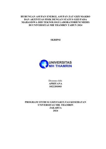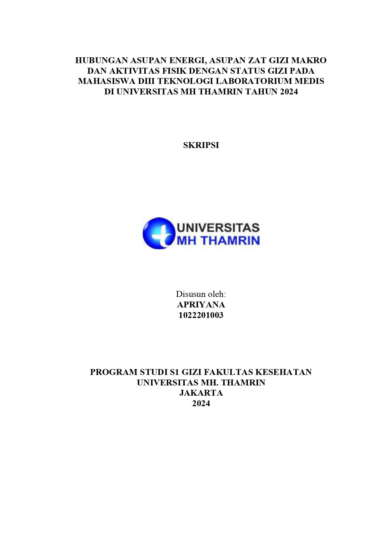 Apriyana, Apriyana (2024) HUBUNGAN ASUPAN ENERGI, ASUPAN ZAT GIZI MAKRO DAN AKTIVITAS FISIK DENGAN STATUS GIZI PADA MAHASISWA DIII TEKNOLOGI LABORATORIUM MEDIS DI UNIVERSITAS MH THAMRIN TAHUN 2024. Other thesis, Universitas Mohammad Husni Thamrin.