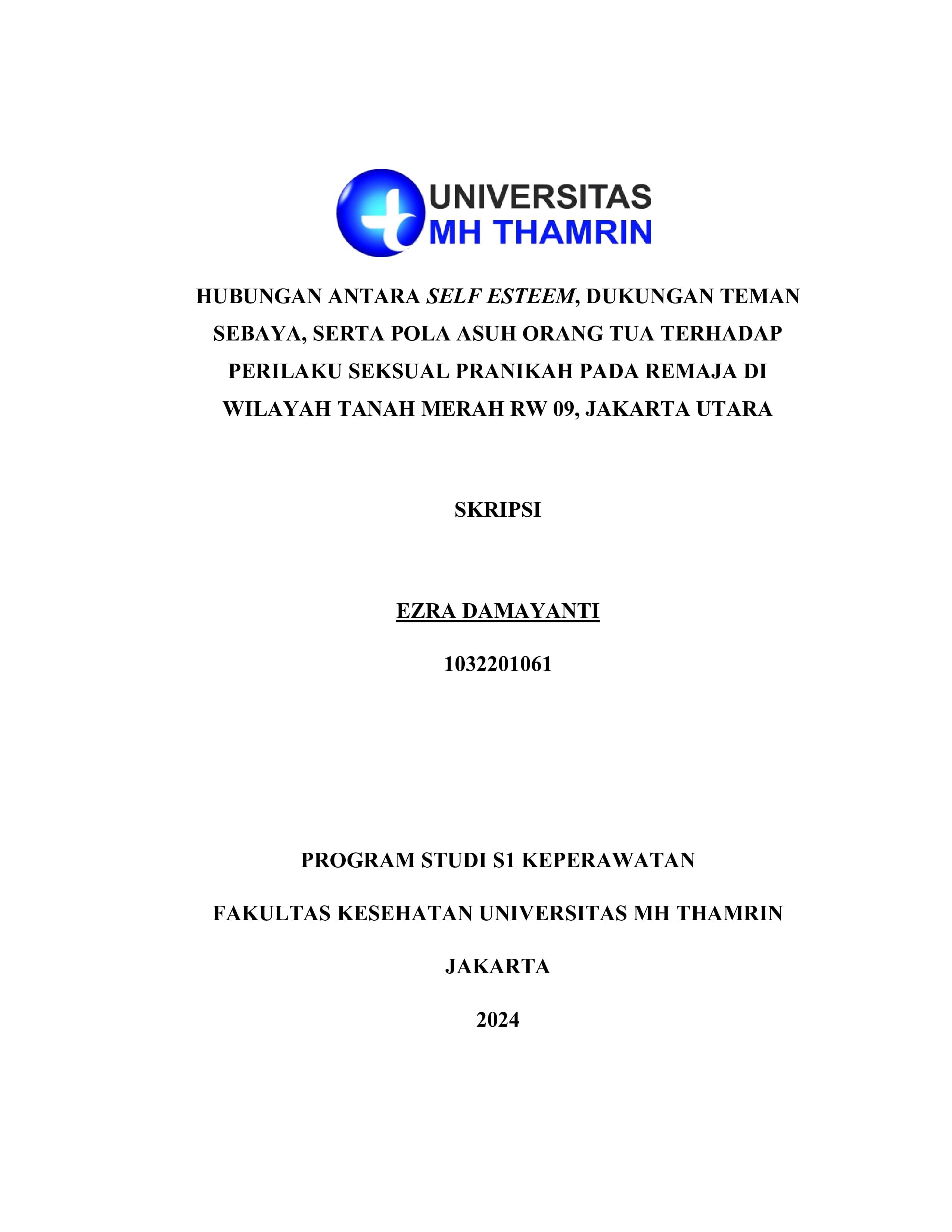 Ezra, Damayanti (2024) HUBUNGAN ANTARA SELF ESTEEM, DUKUNGAN TEMAN SEBAYA, SERTA POLA ASUH ORANG TUA TERHADAP PERILAKU SEKSUAL PRANIKAH PADA REMAJA DI WILAYAH TANAH MERAH RW 09, JAKARTA UTARA. Other thesis, Universitas Mohammad Husni Thamrin.