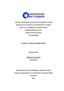 ERVINA, YULIANTI (2024) ASUHAN KEPERAWATAN PADA BAYI BERAT LAHIR RENDAH YANG MENGALAMI DEFISIT NUTRISI MELALUI PEMBERIAN TERAPI PIJAT OROMOTOR DI RUANG PERINATOLOGI RSUD PASAR REBO. Other thesis, Universitas Mohammad Husni Thamrin.
