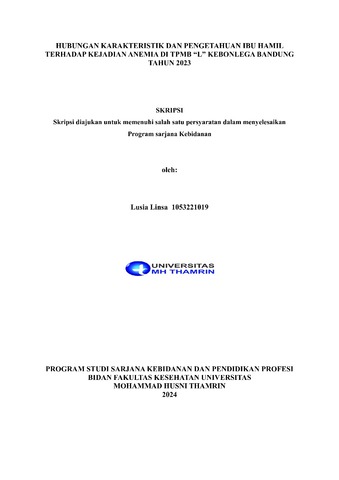 Lusia, Linsa (2024) HUBUNGAN KARAKTERISTIKDAN PENGETAHUAN IBU HAMIL TERHADAP KEJADIAN ANEMIAN DI TPMB "L" KEBONLEGA BANDUNG TAHUN 2023. Other thesis, Universitas Mohammad Husni Thamrin.