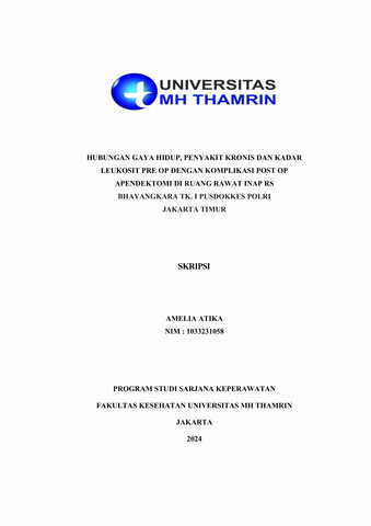 Amelia, Atika (2024) HUBUNGAN GAYA HIDUP, PENYAKIT KRONIS, DAN KADAR LEUKOSIT PRE OP DENGAN KOMPLIKASI POST OP APENDEKTOMI DI RUANG RAWAT INAP RS BHAYANGKARA TK.I PUSDOKKES POLRI. Other thesis, Universitas Mohammad Husni Thamrin.