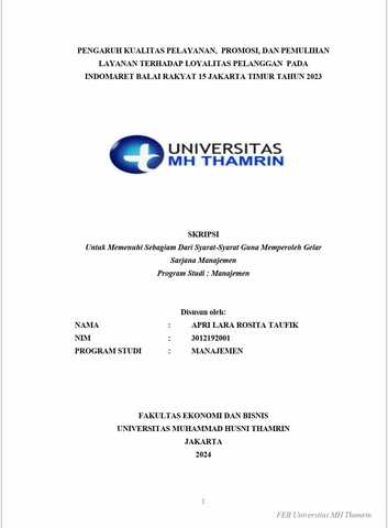 Apri Lara Rosita, Taufik (2024) Pengaruh Kualitas Pelayanan, Promosi, Dan Pemulihan Layanan Terhadap Loyalitas Pelanggan Pada Indomaret Balai Rakyat 15 Jakarta Timur Tahun 2023. Other thesis, Universitas Mohammad Husni Thamrin.