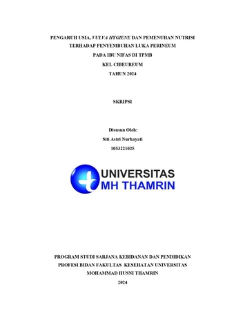 Siti Astri, Nurhayati (2024) PENGARUH USIA, VULVA HYGIENE DAN PEMENUHAN NUTRISI TERHADAP PENYEMBUHAN LUKA PERINEUM PADA IBU NIFAS DI TPMB KELURAHAN CIBEUREUM TAHUN 2024. Other thesis, Universitas Mohammad Husni Thamrin.