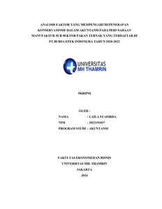 Laila, Syafirda (2024) ANALISIS FAKTOR YANG MEMPENGARUHI PENERAPAN KONSERVATISME DALAM AKUNTANSI PADA PERUSAHAAN MANUFAKTUR SUB SEKTOR PAKAN TERNAK YANG TERDAFTAR DI PT BURSA EFEK INDONESIA TAHUN 2020-2022. Other thesis, Universitas Mohammad Husni Thamrin.