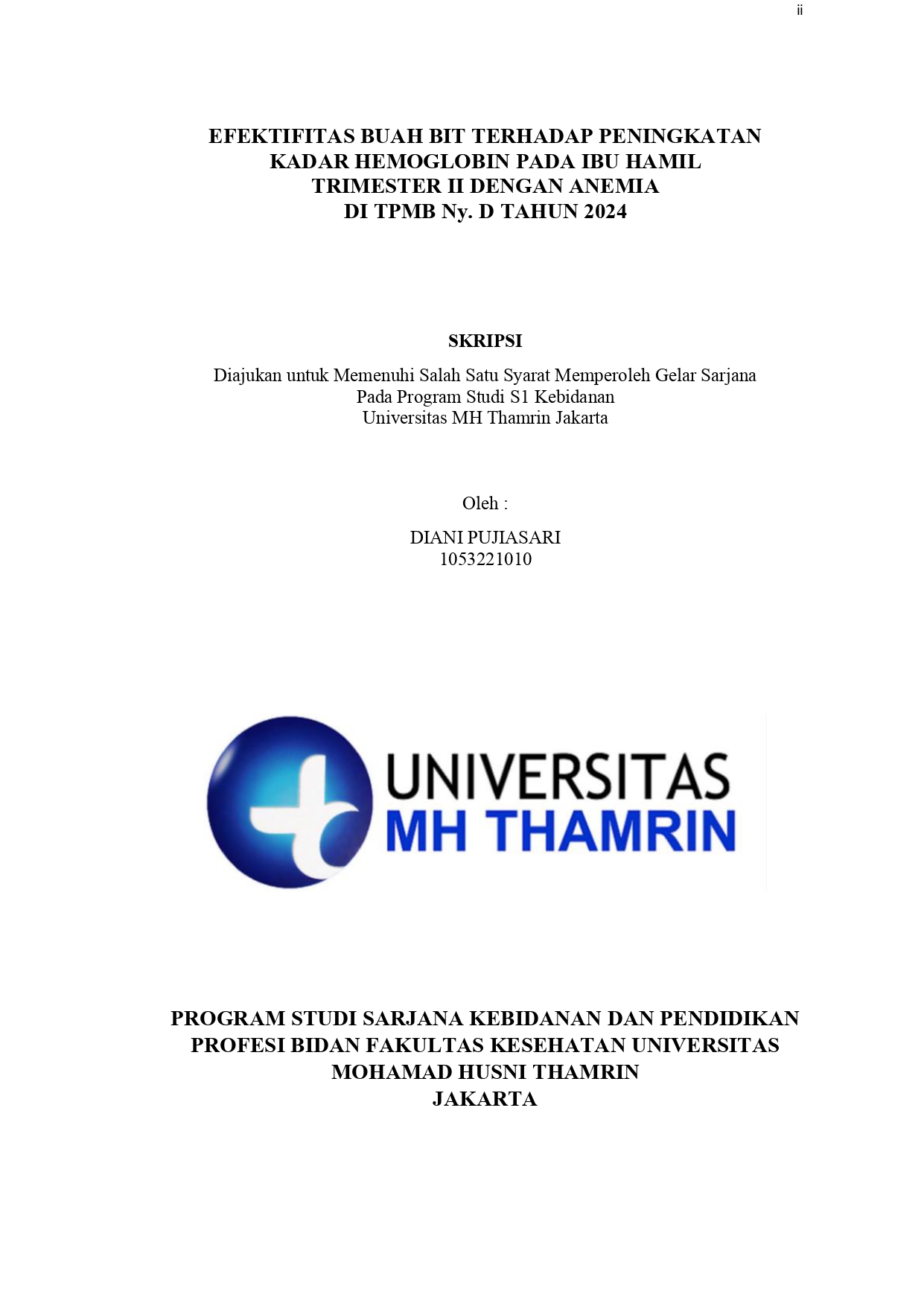 Diani, Pujiasari (2024) EFEKTIFITAS BUAH BIT TERHADAP PENINGKATAN KADAR HEMOGLOBIN PADA IBU HAMIL TRIMESTER II DENGAN ANEMIA DI TPMB Ny. D TAHUN 2024. Other thesis, Universitas Mohammad Husni Thamrin.