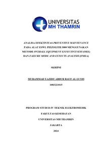 Muhammad Yazidt Abdur, Rauf Al Lutfi (2024) ANALISA EFEKTIVITAS PREVENTIVE MAINTENANCE PADA ALAT ESWL PIEZOLITH 3000 MENGGUNAKAN METODE OVERALL EQUIPMENT EFFECTIVENESS (OEE) DAN FAILURE MODE AND EFFECTS ANALYSIS (FMEA). Other thesis, Universitas Mohammad Husni Thamrin.