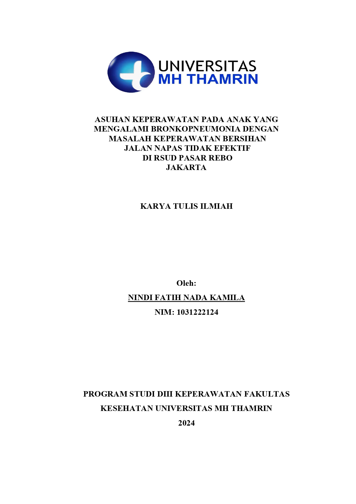 NINDI FATIH NADA, KAMILA (2024) ASUHAN KEPERAWATAN PADA ANAK YANG MENGALAMI BRONKOPNEUMONIA DENGAN MASALAH KEPERAWATAN BERSIHAN JALAN NAPAS TIDAK EFEKTIK DI RSUD PASAR REBO JAKARTA. Diploma thesis, Universitas Mohammad Husni Thamrin.