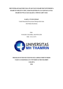 NI MADE CHANDRA ARI, WINATIH (2024) IDENTIFIKASI BAKTERI PADA SWAB ULKUS DIABETIKUM PENDERITA DIABETES MELITUS TIPE 2 DI RUMAH PERAWATAN (RUMAT) LUKA DIABETES WILAYAH JAKARTA TIMUR TAHUN 2024. Diploma thesis, Universitas Mohammad Husni Thamrin.