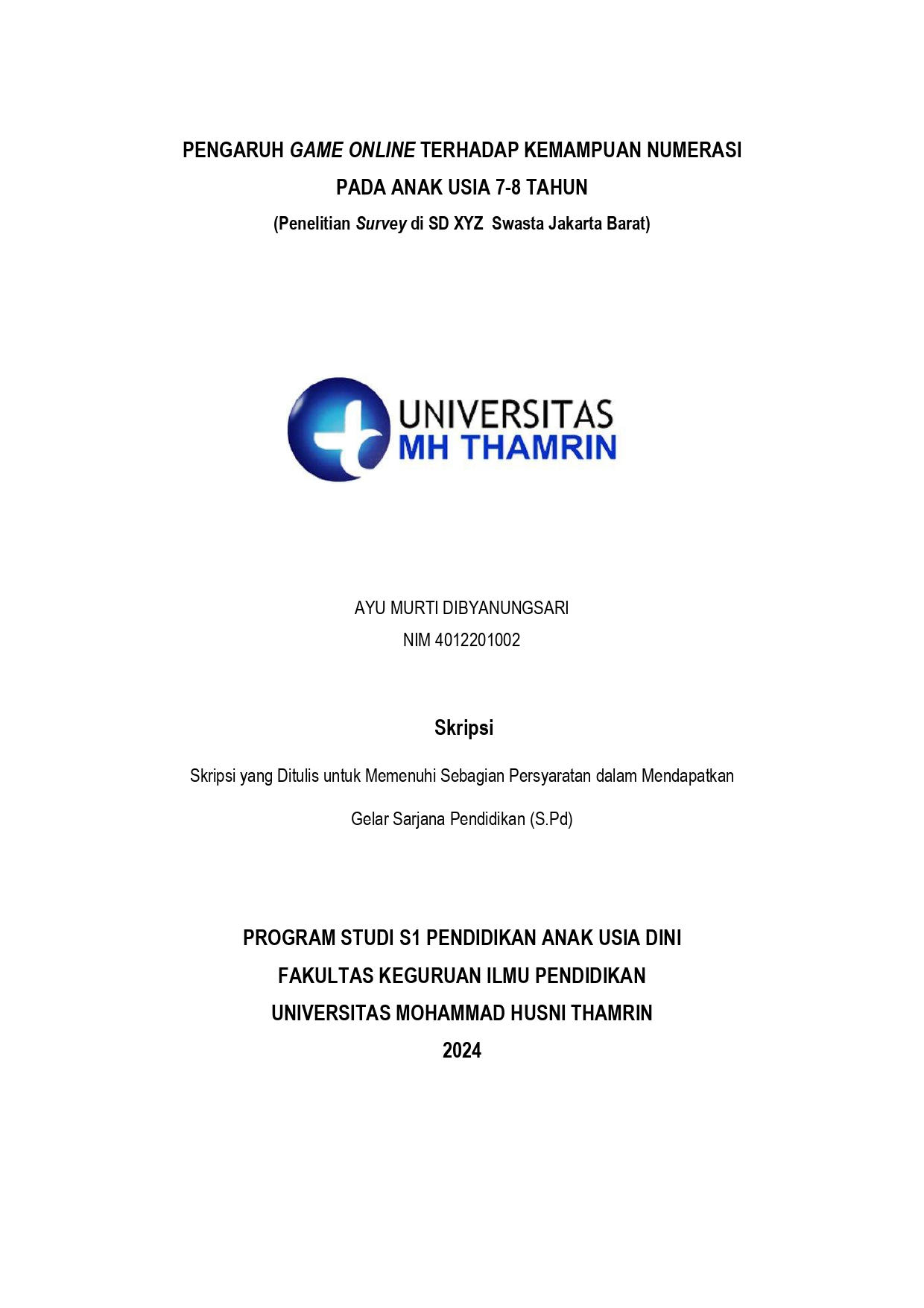 Ayu, Murti Dibyanungsari (2024) PENGARUH GAME ONLINE TERHADAP KEMAMPUAN NUMERASI PADA ANAK USIA 7-8 TAHUN. Other thesis, Universitas Mohammad Husni Thamrin.