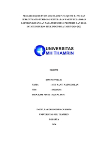 Ayu Santi, Nainggolan (2024) PENGARUH RETURN ON ASSETS, DEBT TO EQUITY RATIO DAN CURRENT RATIO TERHADAP KETEPATAN WAKTU PELAPORAN LAPORAN KEUANGAN PADA PERUSAHAN PROPERTI DAN REAL ESTATE DI BURSA EFEK INDONESIA TAHUN 2020-2022. Other thesis, Universitas Mohammad Husni Thamrin.