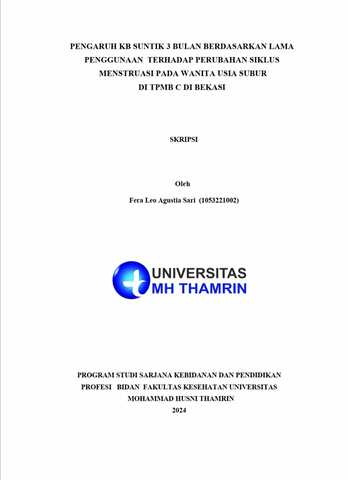 Fera Leo, Agustia Sari (2024) PENGARUH KB SUNTIK 3 BULAN BERDASARKAN LAMA PENGGUNAAN TERHADAP PERUBAHAN SIKLUS MENSTRUASI PADA WANITA USIA SUBUR DI TPMB C DI BEKASI. Other thesis, Universitas Mohammad Husni Thamrin.