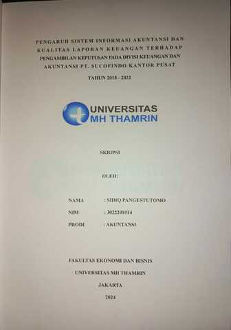 Sidiq, Pangestutomo (2024) Pengaruh Sistem Informasi Akuntansi dan Kualitas Laporan Keuangan Terhadap Pengambilan Keputusan pada Divisi Keuangan dan Akuntansi PT. SUCOFINDO Kantor Pusat Tahun 2018-2022. Other thesis, Universitas Mohammad Husni Thamrin.