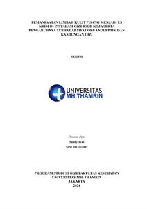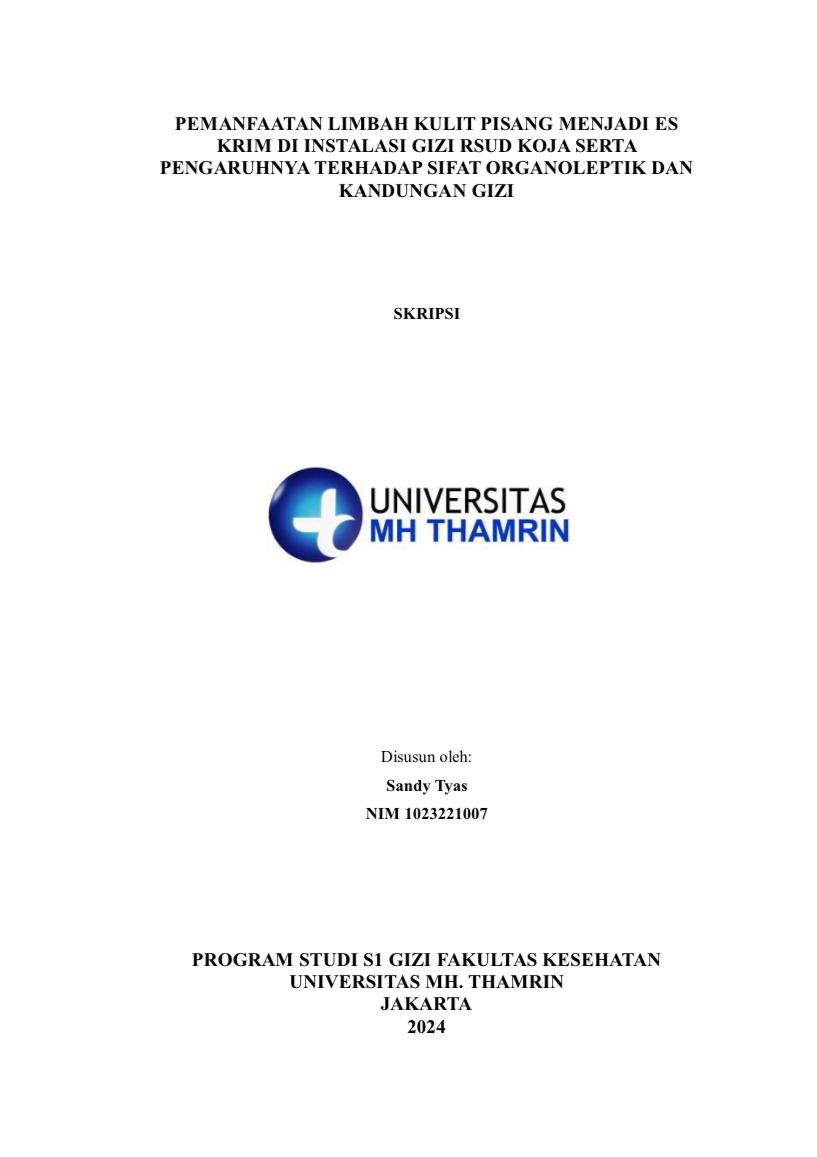 Tyas, Sandy Tyas (2024) PEMANFAATAN LIMBAH KULIT PISANG MENJADI ES KRIM DI INSTALASI GIZI RSUD KOJA SERTA PENGARUHNYA TERHADAP SIFAT ORGANOLEPTIK DAN KANDUNGAN GIZI. Other thesis, Universitas Mohammad Husni Thamrin.