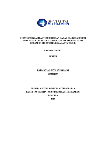 Rahmaniar Jaya, Anggraini (2024) HUBUNGAN KUALITAS TIDUR DENGAN KADAR GLUKOSA DARAH PADA PASIEN DIABETES MELITUS TIPE 2 DI POLI PENYAKIT DALAM RS DIK PUSDIKKES JAKARTA TIMUR. Other thesis, Universitas Mohammad Husni Thamrin.