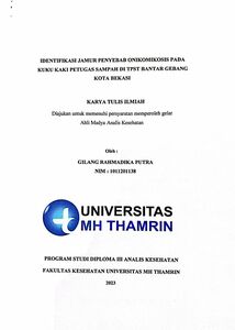 Gilang Rahmadika, Putra (2023) IDENTIFIKASI JAMUR PENYEBAB ONIKOMIKOSIS PADA KUKU KAKI PETUGAS SAMPAH DI TPST BANTAR GEBANG KOTA BEKASI. Diploma thesis, Universitas Mohammad Husni Thamrin.