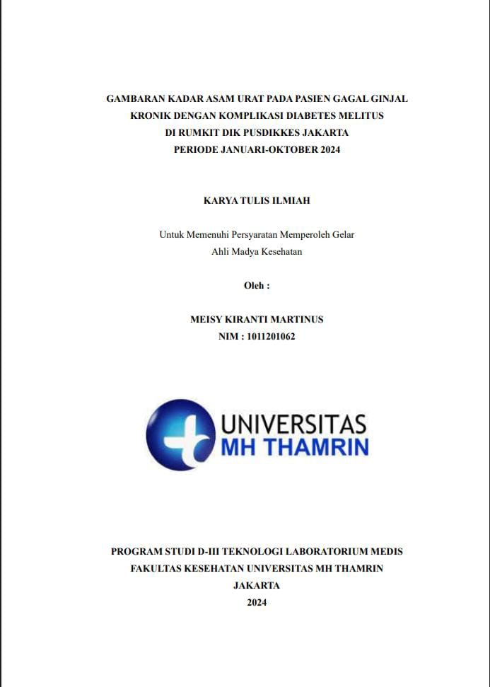 Martinus, Meisy Kiranti (2024) GAMBARAN KADAR ASAM URAT PADA PASIEN GAGAL GINJAL KRONIK DENGAN KOMPLIKASI DIABETES MELITUS DI RUMKIT DIK PUSDIKKES JAKARTA PERIODE JANUARI-OKTOBER 2024. Diploma thesis, Universitas Mohammad Husni Thamrin.