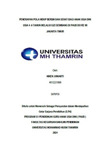 Niken, Juniarti (2024) PENERAPAN POLA HIDUP BERSIH DAN SEHAT BAGI ANAK USIA DINI USIA 4 -6 TAHUN MELALUI GIZI SEIMBANG DI PAUD DO RE MI JAKARTA TIMUR. Other thesis, Universitas Mohammad Husni Thamrin.