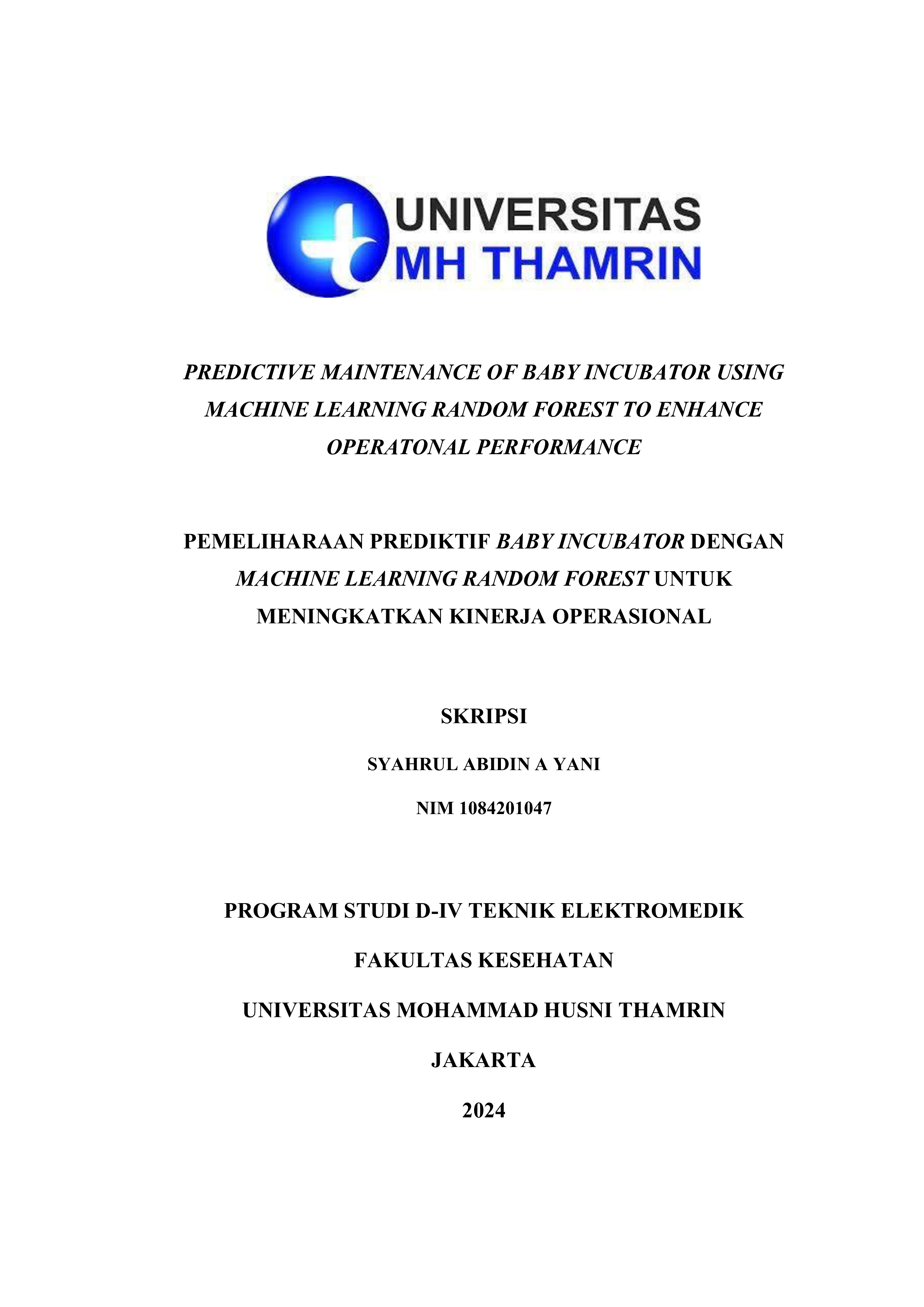 Syahrul, Abidin A Yani (2024) PEMELIHARAAN PREDIKTIF BABY INCUBATOR DENGAN MACHINE LEARNING RANDOM FOREST UNTUK MENINGKATKAN KINERJA OPERASIONAL. Diploma thesis, Universitas Mohammad Husni Thamrin.