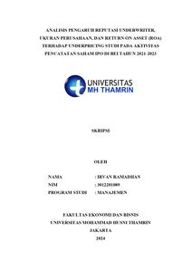 Irvan, Ramadhan (2024) ANALISIS PENGARUH REPUTASI UNDERWRITER, UKURAN PERUSAHAAN, DAN RETURN ON ASSET (ROA) TERHADAP UNDERPRICING STUDI PADA AKTIVITAS PENCATATAN SAHAM IPO DI BEI TAHUN 2021-2023. Other thesis, Universitas Mohammad Husni Thamrin.