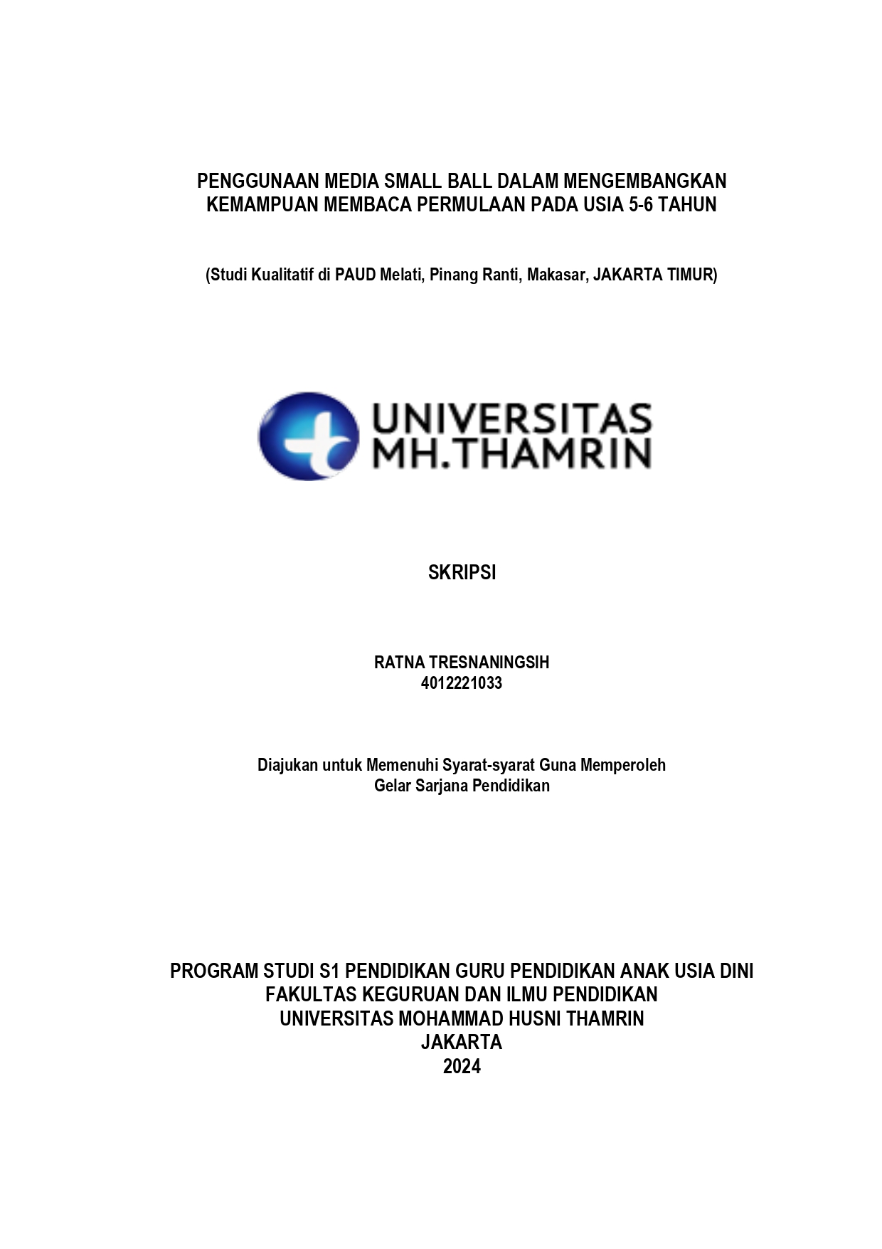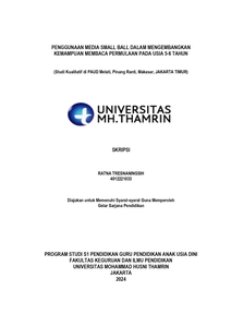 Ratna, Tresnaningsih (2024) PENGGUNAAN MEDIA SMALL BALL DALAM MENGEMBANGKAN KEMAMPUAN MEMBACA PERMULAAN PADA USIA 5-6 TAHUN. Other thesis, Universitas Mohammad Husni Thamrin.