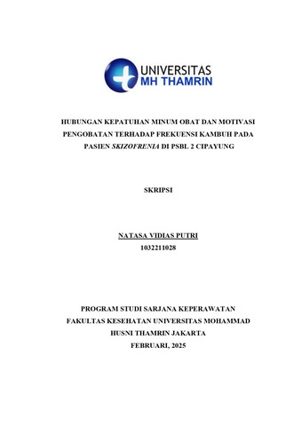 Natasa Vidias, Putri (2025) HUBUNGAN KEPATUHAN MINUM OBAT DAN MOTIVASI PENGOBATAN TERHADAP FREKUENSI KAMBUH PADA PASIEN SKIZOFRENIA DI PSBL 2 CIPAYUNG. Other thesis, Universitas Mohammad Husni Thamrin.