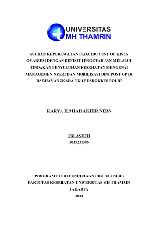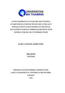 Tri, Astuti (2024) ASUHAN KEPERAWATAN PADA IBU POST OP KISTA OVARIUM DENGAN DEFISIT PENGETAHUAN MELALUI TINDAKAN PENYULUHAN KESEHATAN MENGENAI MANAJEMEN NYERI DAN MOBILISASI DINI POST OP DI RS BHAYANGKARA TK.1 PUSDOKKES POLRI. Other thesis, Universitas Mohammad Husni Thamrin.