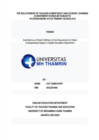 Cut, Damayanti (2022) THE RELATIONSHIP OF TEACHER COMPETENCY AND STUDENT LEARNING ACHIEVEMENT IN ENGLISH SUBJECTS IN CENGKARENG STATE PRIMARY SCHOOLS 05. Other thesis, Universitas Mohammad Husni Thamrin.
