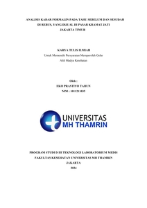 Eko Prastiyo, Tahun (2024) ANALISIS KADAR FORMALIN PADA TAHU SEBELUM DAN SESUDAH DIREBUS YANG DIJUAL DIPASAR KRAMAT JATI, JAKARTA TIMUR. Diploma thesis, Universitas Mohammad Husni Thamrin.