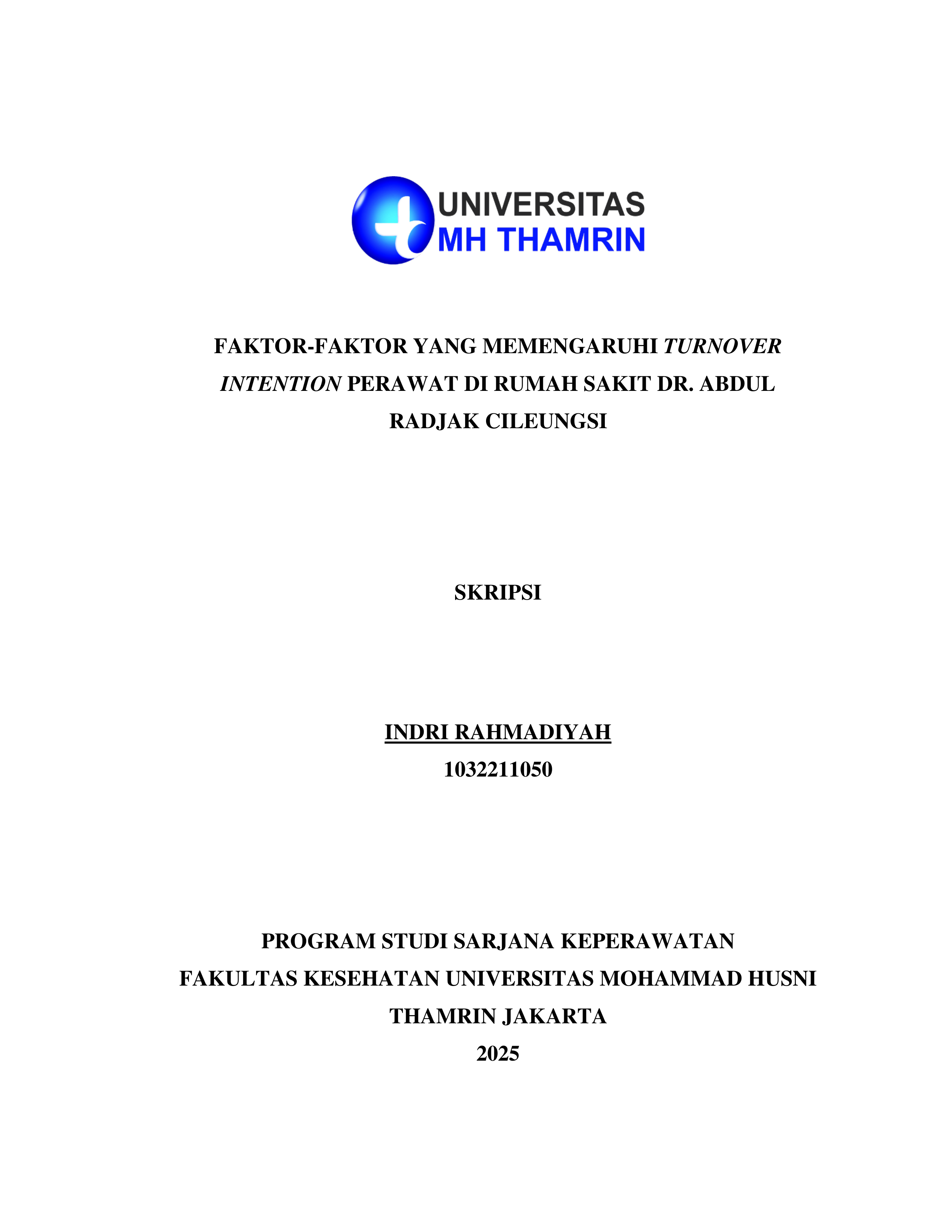 Indri, Rahmadiyah (2025) FAKTOR-FAKTOR YANG MEMENGARUHI TURNOVER INTENTION PERAWAT DI RUMAH SAKIT DR. ABDUL RADJAK CILEUNGSI. Other thesis, Universitas Mohammad Husni Thamrin.