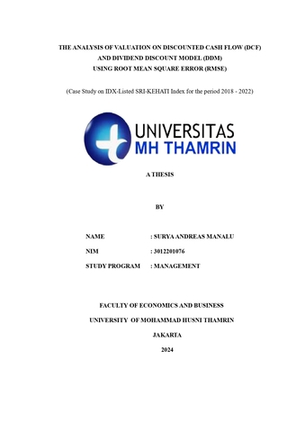 Surya Andreas, Manalu (2024) THE ANALYSIS OF VALUATION ON DISCOUNTED CASH FLOW (DCF) AND DIVIDEND DISCOUNT MODEL (DDM) USING ROOT MEAN SQUARE ERROR (RMSE) (Case Study on IDX-Listed SRI-KEHATI Index for the period 2018-2022). Other thesis, Universitas Mohammad Husni Thamrin.