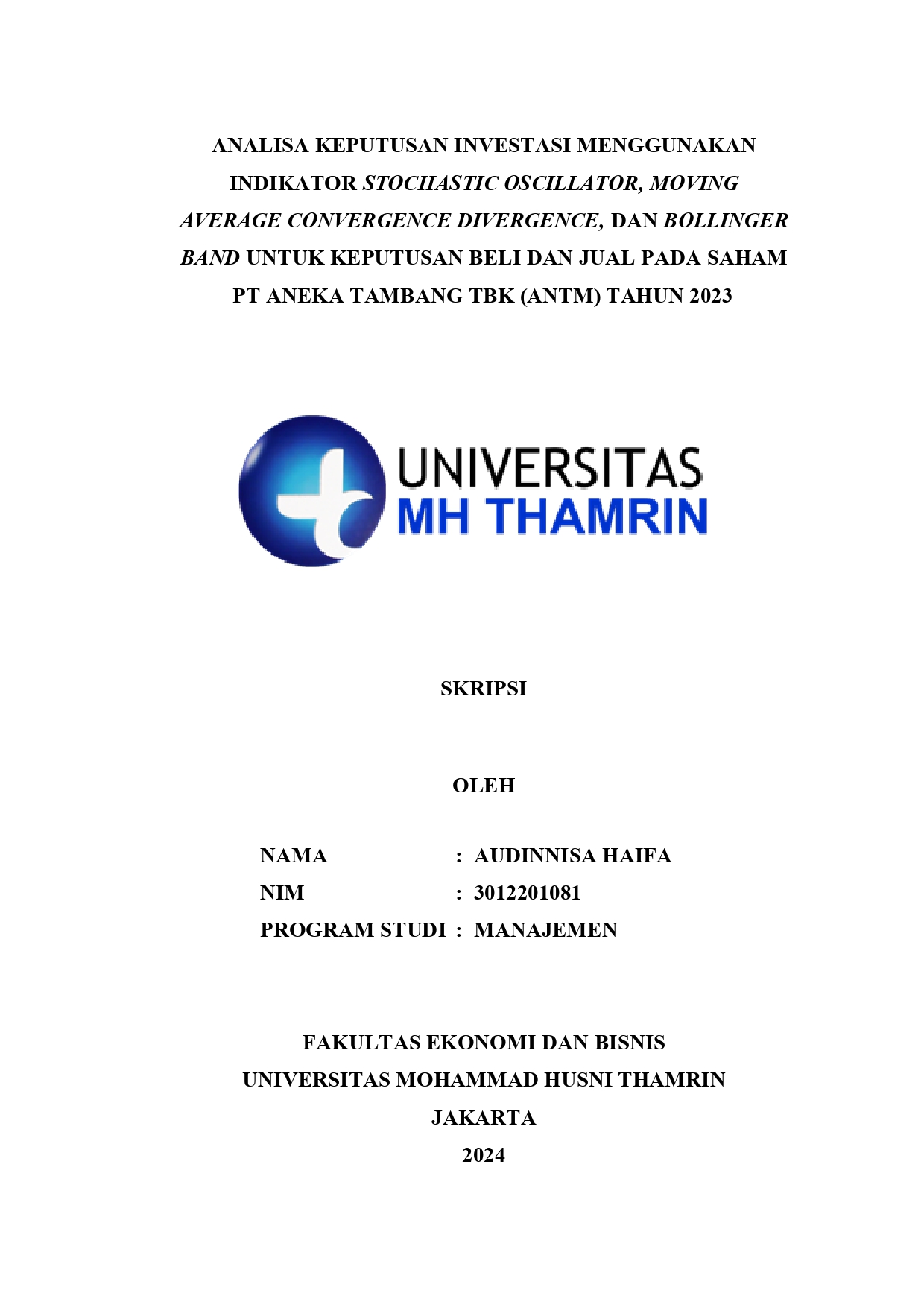 Audinnisa, Haifa (2024) ANALISA KEPUTUSAN INVESTASI MENGGUNAKAN INDIKATOR STOCHASTIC OSCILLATOR, MOVING AVERAGE CONVERGENCE DIVERGENCE, DAN BOLLINGER BAND UNTUK KEPUTUSAN BELI DAN JUAL PADA SAHAM PT ANEKA TAMBANG TBK. (ANTM) TAHUN 2023. Other thesis, Universitas Mohammad Husni Thamrin.