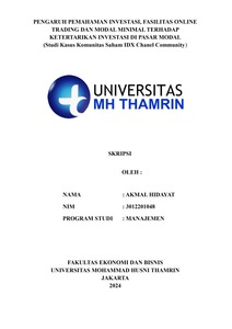 Akmal, Hidayat (2024) PENGARUH PEMAHAMAN INVESTASI, FASILITAS ONLINE TRADING DAN MODAL MINIMAL TERHADAPA KETERTARIKAN INVESTASI DI PASAR MODAL. Other thesis, Universitas Mohammad Husni Thamrin.