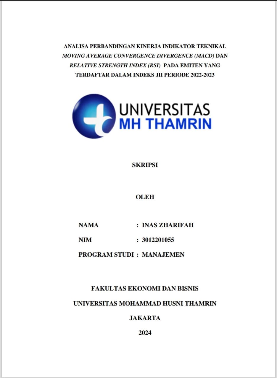 Inas, Zharifah (2024) Analisa Perbandingan Kinerja Indikator Teknikal Moving Average Convergence Divergence (MACD) dan Relative Strenght Index (RSI) pada Emiten yang Terdaftar dalam Indeks JII Periode 2022 - 2023. Other thesis, Universitas Mohammad Husni Thamrin.