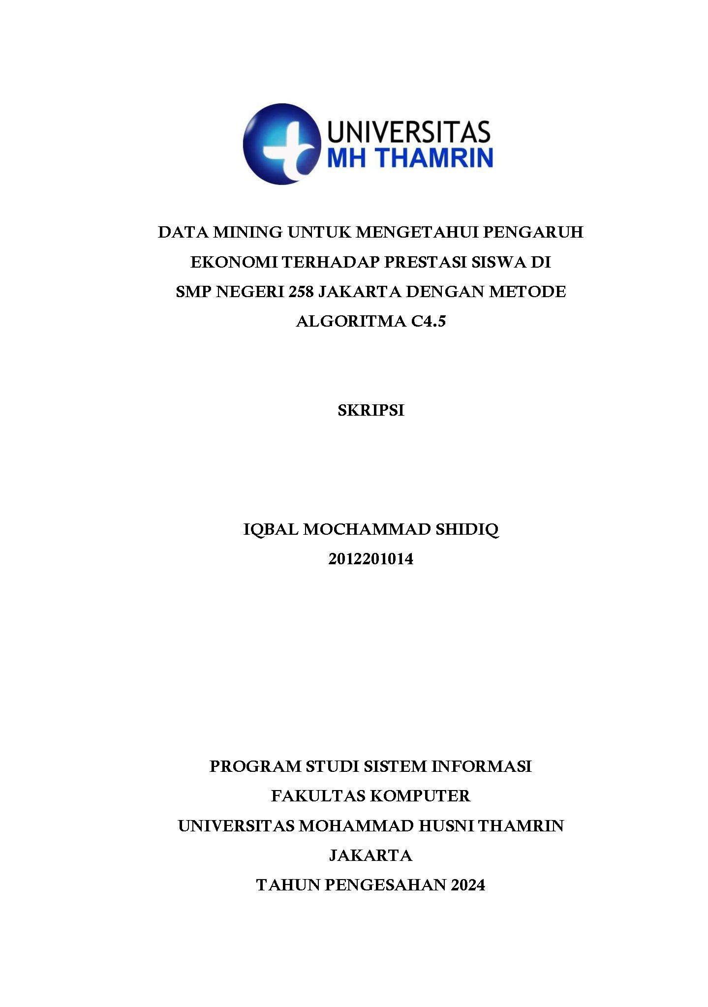 Iqbal Mochammad, Shidiq (2024) DATA MINING UNTUK MENGETAHUI PENGARUH EKONOMI TERHADAP PRESTASI SISWA DI SMP NEGERI 258 JAKARTA DENGAN METODE ALGORITMA C4.5. Other thesis, Universitas Mohammad Husni Thamrin.