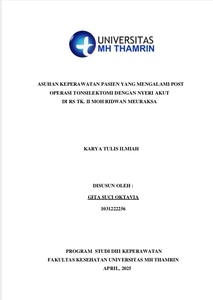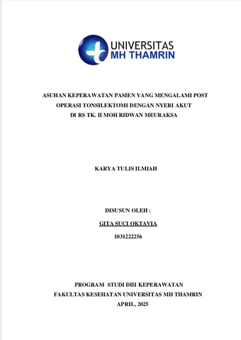 Gita Suci, Oktavia (2025) ASUHAN KEPERAWATAN PASIEN YANG MENGALAMI POST OPERASI TONSILEKTOMI DENGAN NYERI AKUT DI RS TK. II MOH RIDWAN MEURAKSA. Diploma thesis, Universitas Mohammad Husni Thamrin.