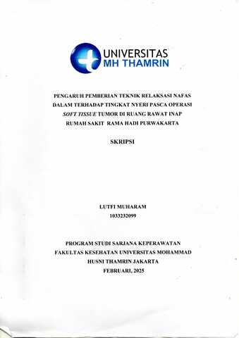 Lutfi, Muharam (2025) PENGARUH PEMBERIAN TEKNIK RELAKSASI NAFAS DALAM TERHADAP TINGKAT NYERI PASCA OPERASI SOFT TISSUE TUMOR DI RUANG RAWAT INAP RUMAH SAKIT RAMA HADI PURWAKARTA. Other thesis, Universitas Mohammad Husni Thamrin.