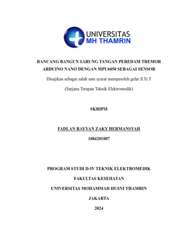 Fadlan Rayyan Zaky, Hermansyah (2024) RANCANG BANGUN SARUNG TANGAN PEREDAM TREMOR ARDUINO NANO DENGAN MPU6050 SEBAGAI SENSOR. Other thesis, Universitas Mohammad Husni Thamrin.