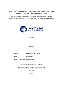 Vena Putri, Maejuna (2024) PENGARUH RETURN ON ASSET (ROA), DEBT TO EQUITY RATIO (DER) DAN CURRENT RATIO (CR) TERHADAP HARGA SAHAM (STUDY EMPIRIS PADA PERUSAHAAN MANUFAKTUR SUB SEKTOR MAKANAN DAN MINUMAN YANG TERDAFTAR DI BEI PERIODE 2018-2022). Other thesis, Universitas Mohammad Husni Thamrin.